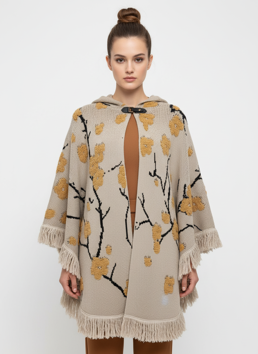 Kış mevsiminin soğuk günlerinde şıklık ve koruma sunan bu kadın panço, kabartmalı çiçek desenleri ve fonksiyonel kapüşon tasarımıyla dikkat çekiyor. Bej-Sarı tonlarındaki zarif renk geçişleriyle panço modelleri arasında öne çıkan bu ürün, soğuk havalarda hem sıcak tutuyor hem de tarzınızı tamamlıyor.
