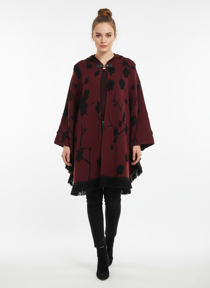 Bordo Kabartmalı Çiçek Desenli Kapüşonlu Kadın Panço (104.04218)