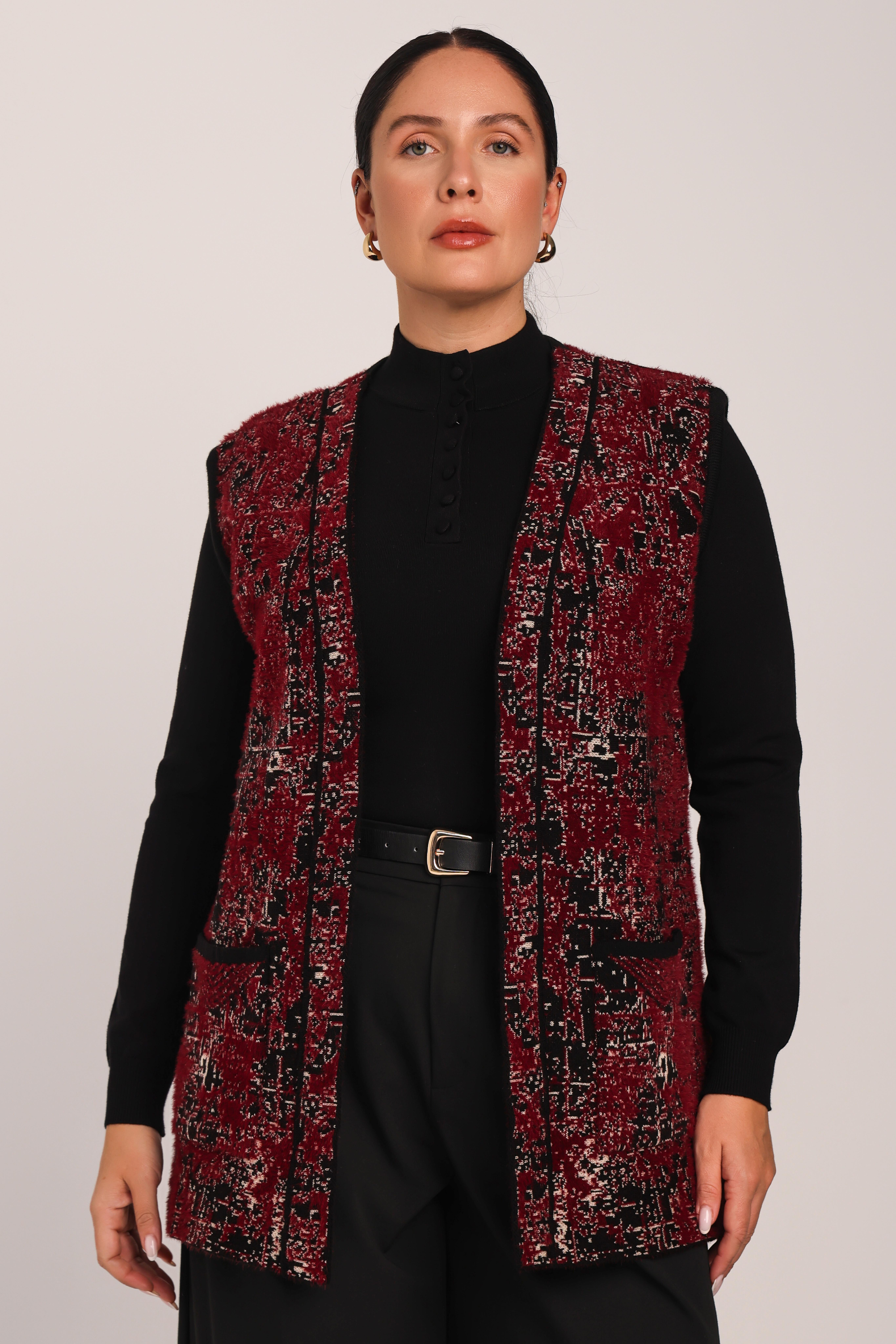 Sakal iplikten üretilen ve yumuşak tüylü yapısıyla dikkat çeken bu triko yelek, kış mevsiminin soğuk günleri için özel olarak tasarlandı. Bordo rengin klasik şıklığını cepli tasarımıyla birleştiren yeleğimiz, yelek modelleri arasında öne çıkıyor.