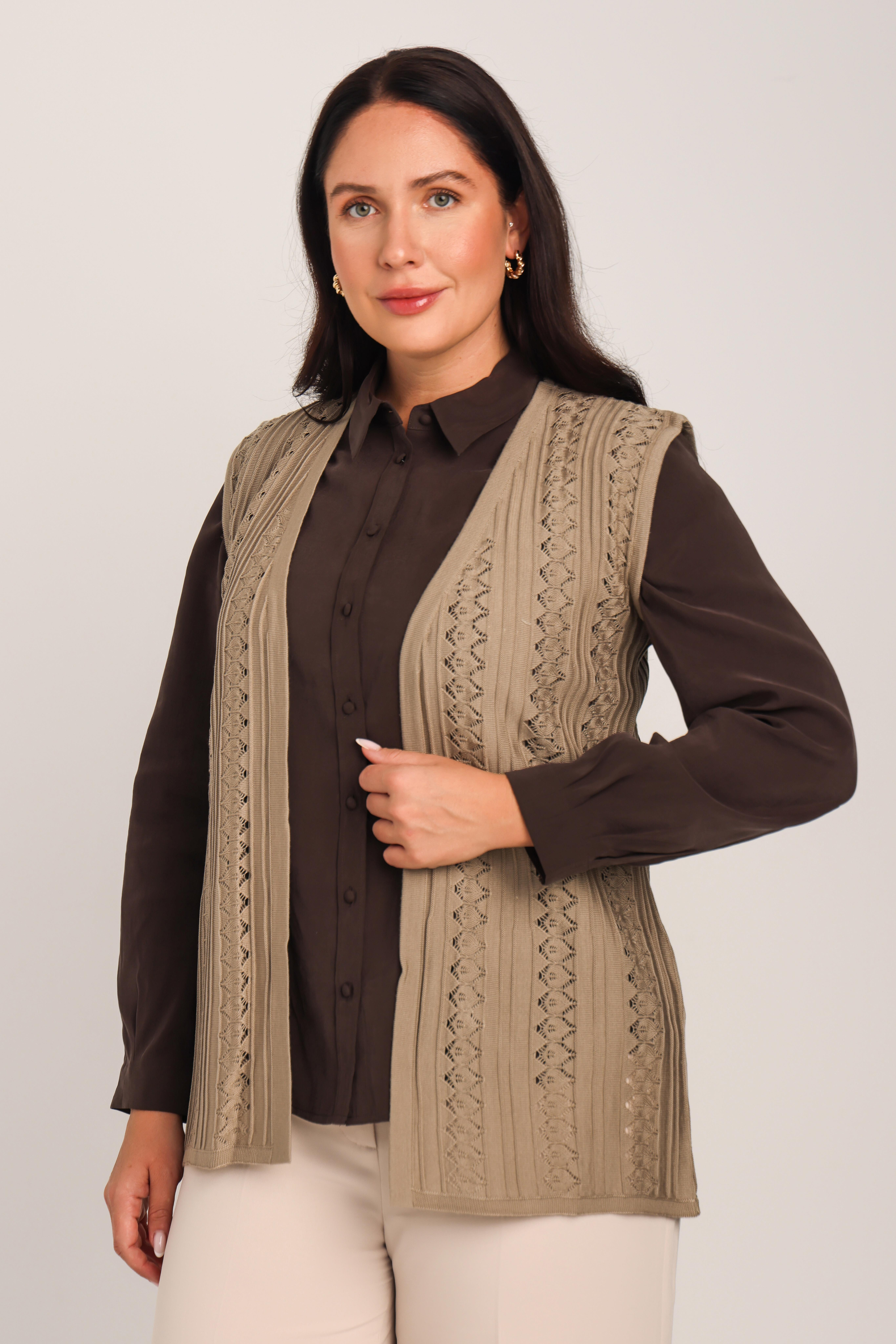 Merserize triko kumaşın zarif dantel işlemeleriyle dikkat çeken kadın yelek ürünümüz, kum rengiyle yelek modelleri arasında öne çıkıyor. Hem günlük kullanım hem de özel günler için şık bir alternatif sunan ürünümüz, mevsimlik yelek arayanlar için ideal bir seçenek.