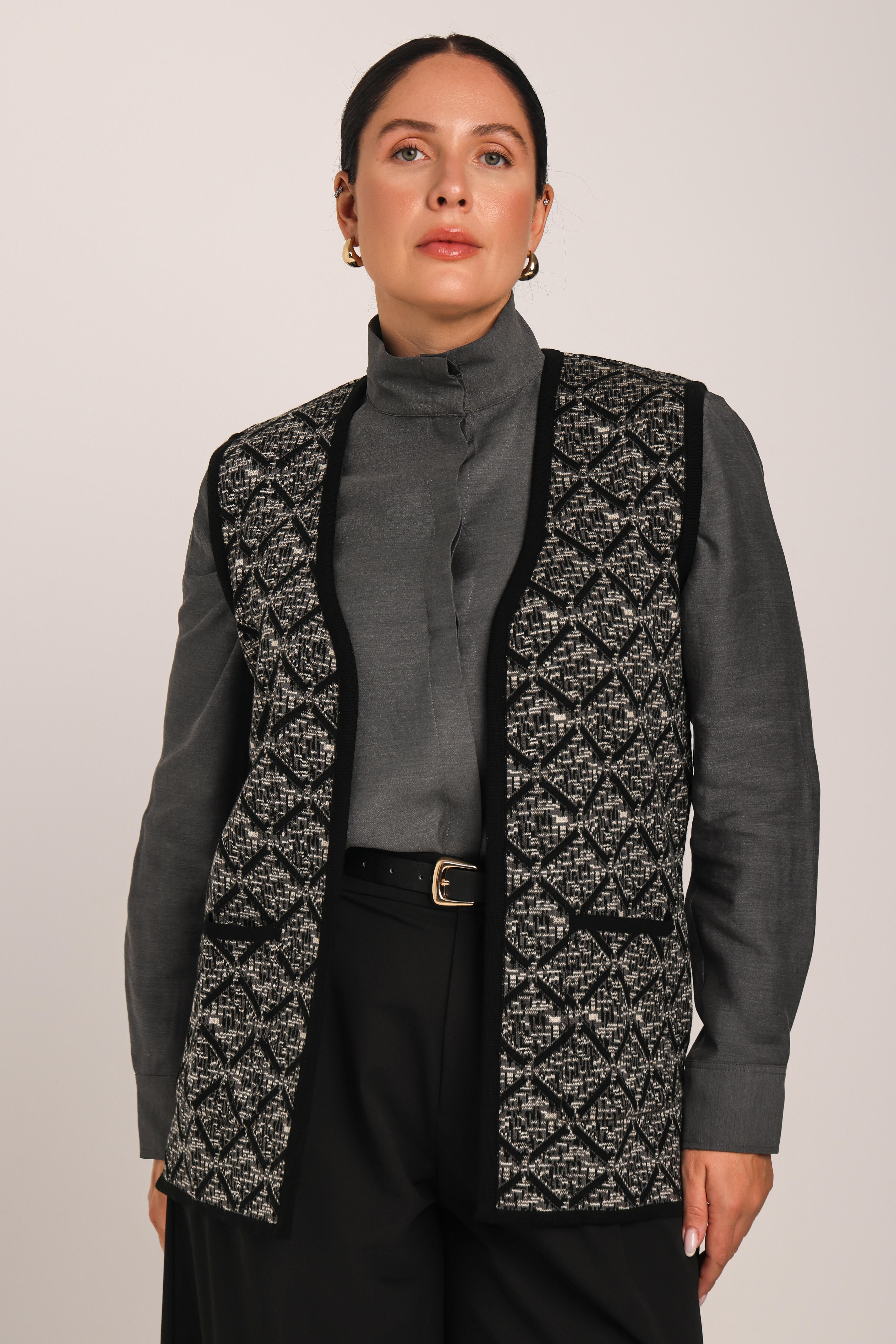 Uludağ Triko'nun kaliteli %100 triko kumaşından üretilen bu kadın yelek, zarif baklava deseni ve fonksiyonel cepli tasarımıyla dikkat çekiyor. Siyah rengiyle yelek modelleri arasında öne çıkan bu ürün, hem günlük kullanım hem de özel günler için ideal bir seçenek sunuyor
