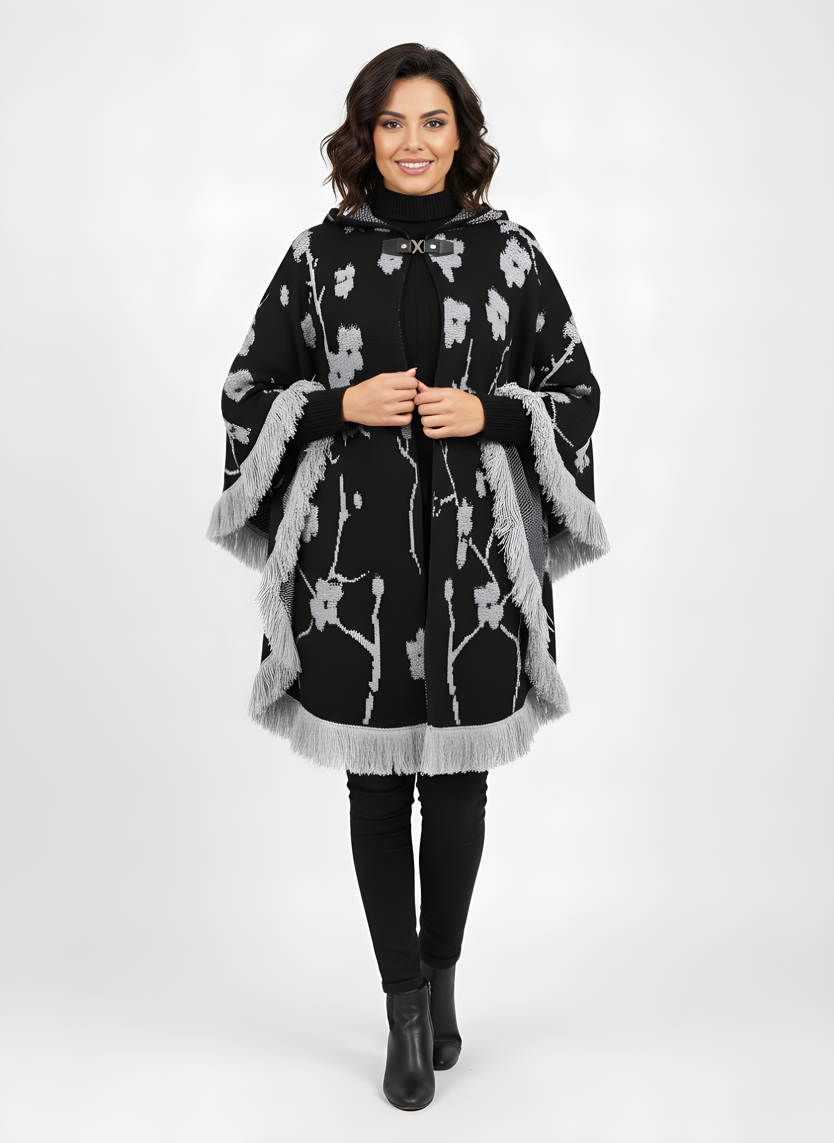 Kış mevsiminin soğuk günlerinde şıklık ve koruma sunan bu kadın panço, kabartmalı çiçek desenleri ve fonksiyonel kapüşon tasarımıyla dikkat çekiyor. Siyah-gri tonlarındaki zarif renk geçişleriyle panço modelleri arasında öne çıkan bu ürün, soğuk havalarda hem sıcak tutuyor hem de tarzınızı tamamlıyor.